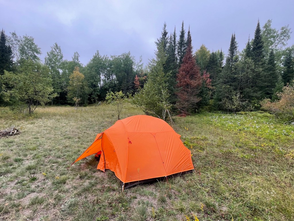 Diana decided that the town campground was not worth the $35 because there was no shower anyway. So we biked out of town until we arrived at another section of the Chequamegon National Forest and then we turned down the first dirt path that we saw and found a nice little glade and camped there.