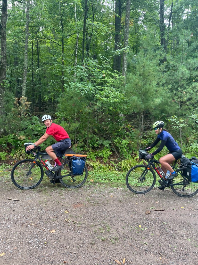I guess you wanna hear about the riding. There were a lot of trees. It was kinda cold – temps in the 50s and on and off rain/mist all day long. We must have stopped to take our jackets off or put them back on 10 times. But it wasn’t super hilly – which can be kind of a drag with bikes that weigh 60+ pounds fully loaded . . . And the wind wasn’t against us most of the time.