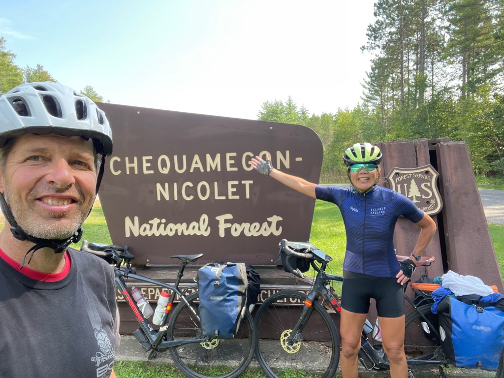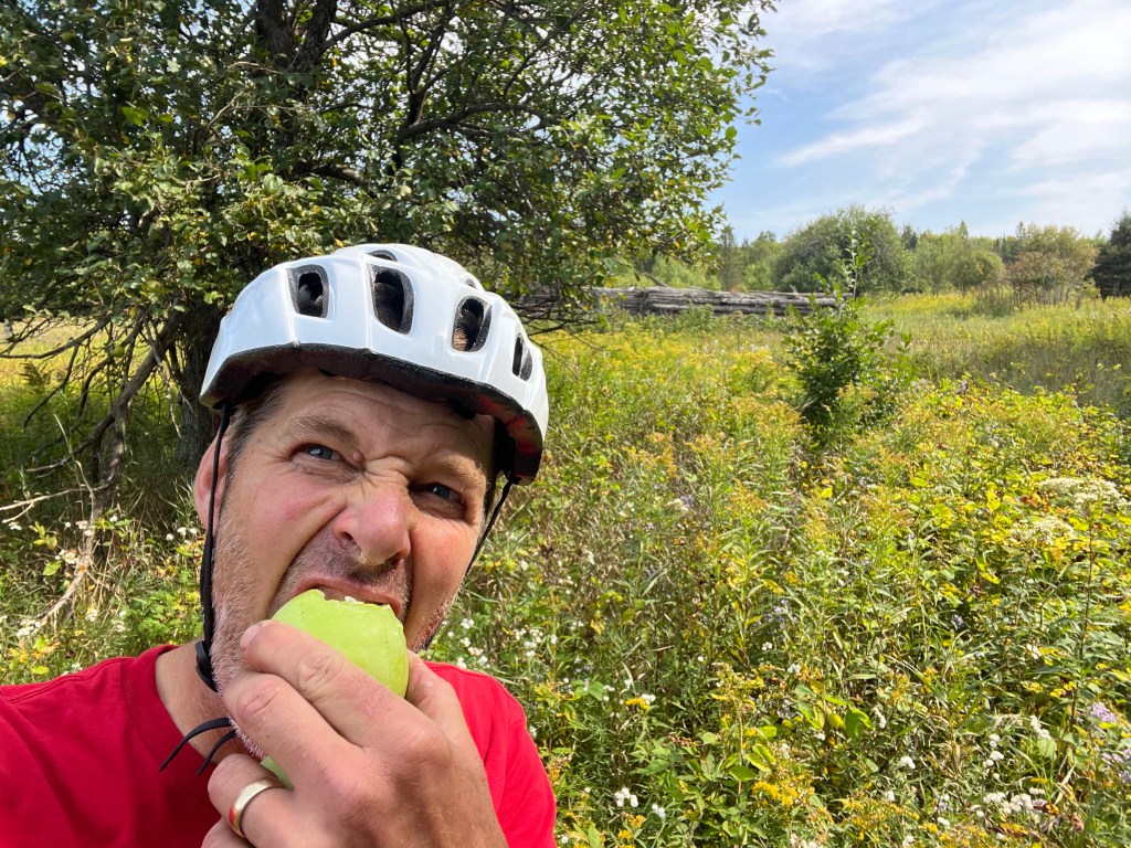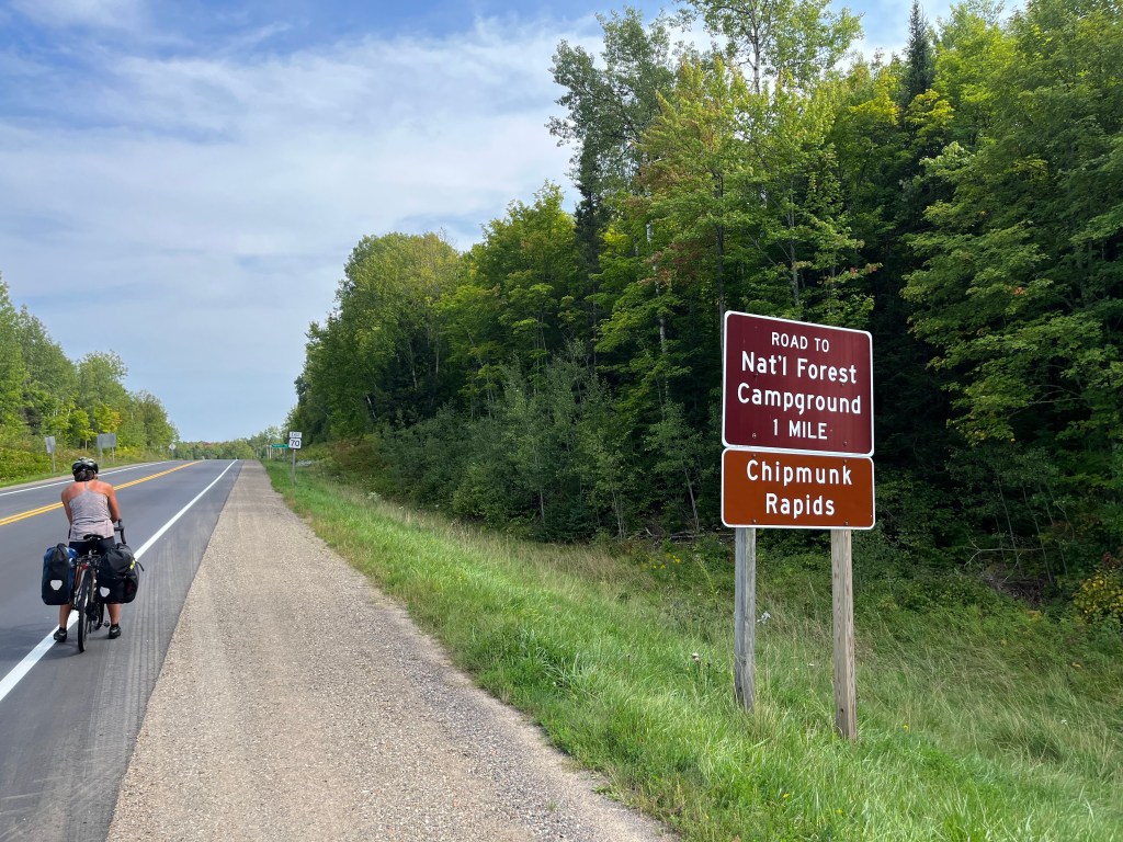 The day started with some regret. I mean, it was kind of cool and all – seeing a wolf pretty much right out of the gate after leaving the campground. But Diana didn’t see it. And I didn’t have the special helmet I purchased online a few weeks ago for just such an occasion. It’s so cool. You are biking along, you see a wolf, or a dolphin, or a UFO – or – we are near the U.P. – maybe we see Bigfoot or Sasquatch or whatever his name is. (Is it sexist to assume that Bigfoot is a he? Or would no she want to be Bigfoot anyway?) Now, normally you see it and you tell everyone about it and they go: “Oh, yeah, that’s great John. Did you get a picture? How many eyes did the alien have?” And you know they don’t believe you . . . So sad.