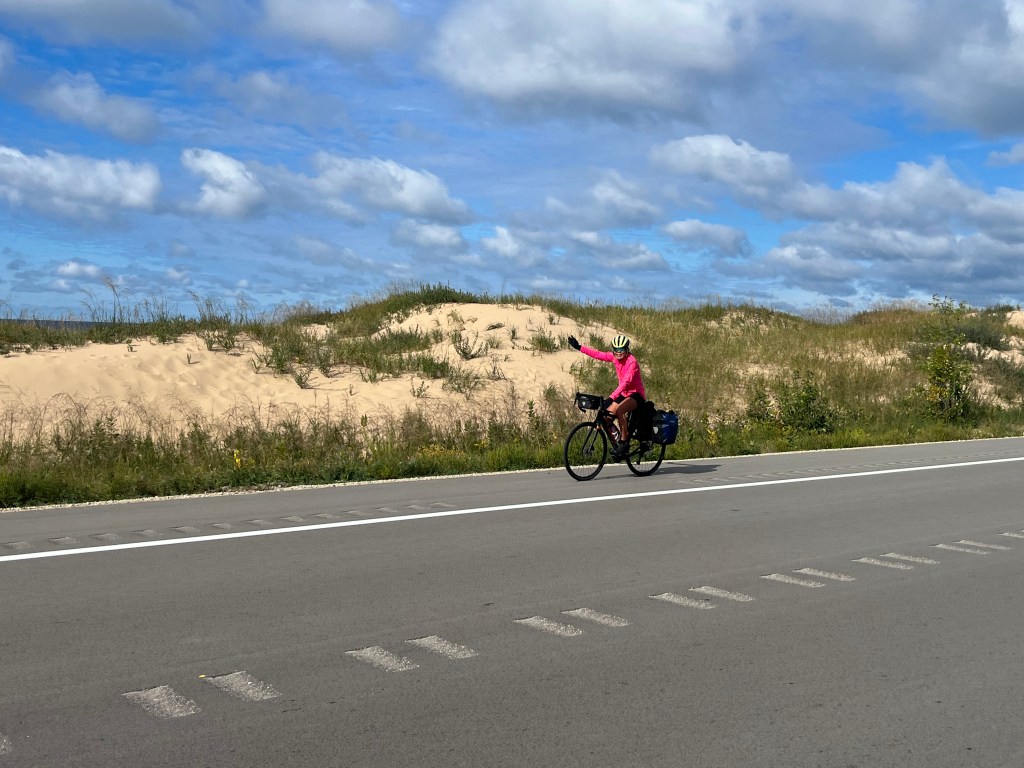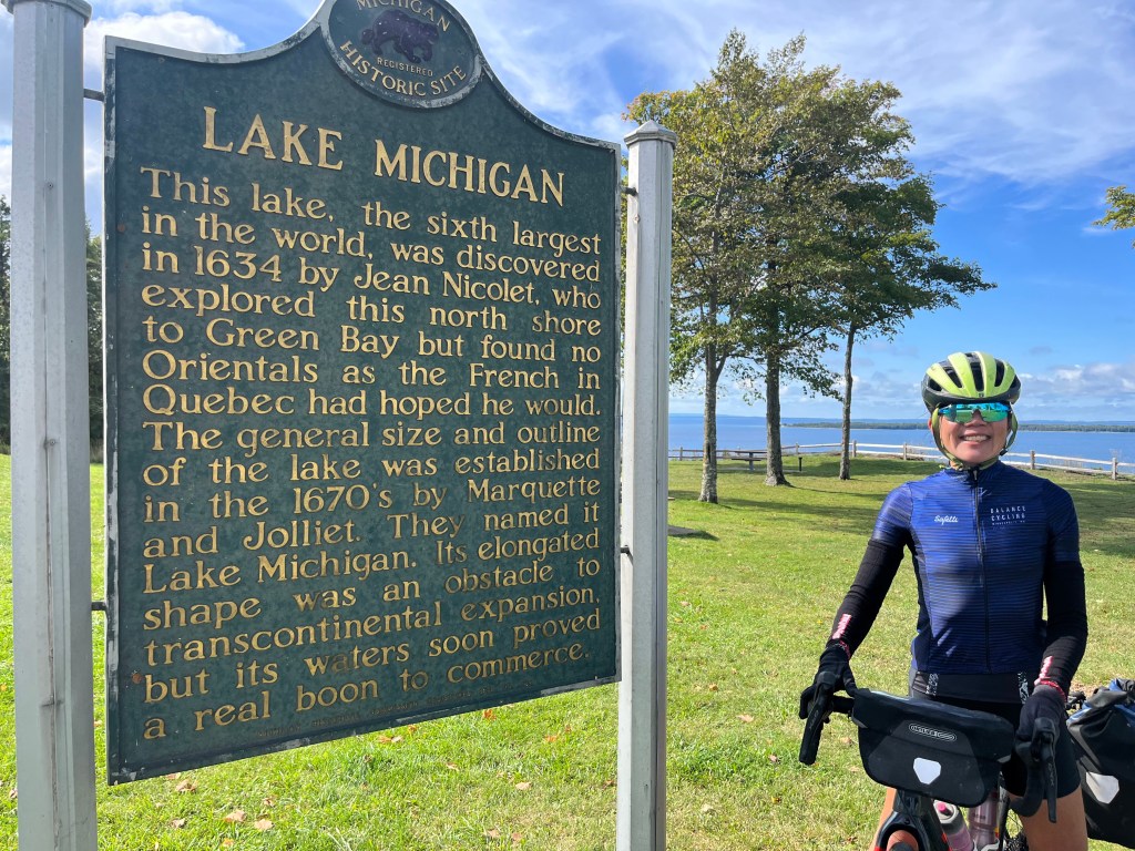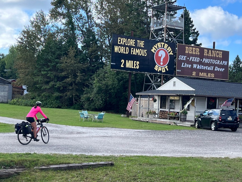 We’re biking along at a good clip, but inevitably there’s a picture we just have to take. For instance, I had to take a picture of a billboard imploring us to: “Explore the World Famous Mystery Spot – only two miles ahead!” (I’ve been searching for the mystery spot since at least 1995 – probably really started looking for it in college – so the opportunity to explore THE Mystery Spot was more than a little intriguing.) And then Diana had to stop to take pictures of the Mackinac Bridge. We both thought it was important to take pictures of the dunes and the shore. You get the idea.