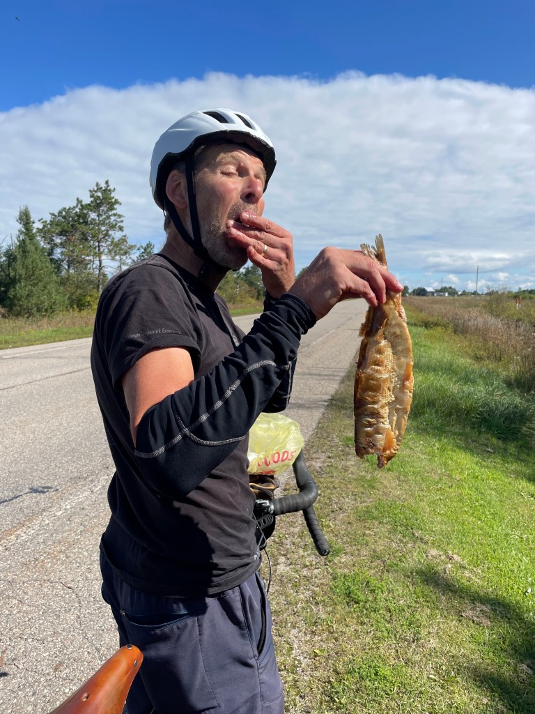 But (this) man cannot live on apples alone. (Although Steve Jobs tried to do it at one point. Nothing but apples for like two weeks. Didn’t work out so well . . .) And, once again,it’s not like there were any pastie shops along the way today. (Where are they when you need them?) Fortunately, I had some leftover smoked fish to nibble on. See picture. It was yummy.