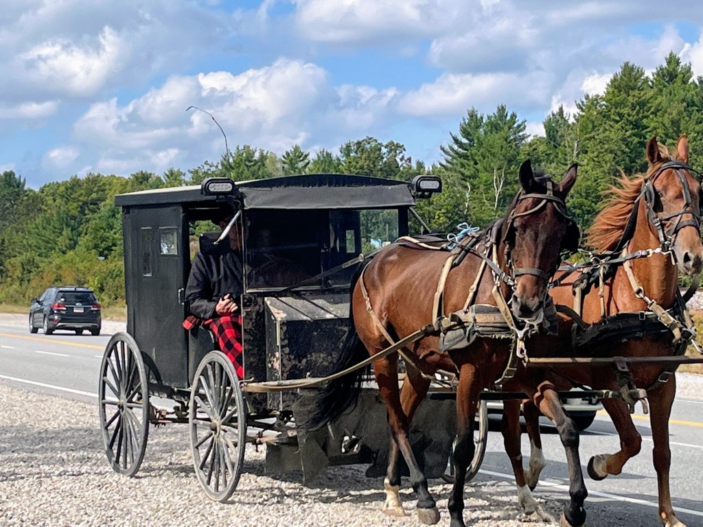 We had no sooner walked out of the breakfast joint – we’re oiling our chains as we stand on the side of the road along the TCH – when what, to our wandering eyes did appear – Mennonite Rush Hour! It was crazy! Just down the street about a dozen horse and buggies charged onto the TCH, raced down the highway, over a bridge, and turned off in different directions – gone in an instant.