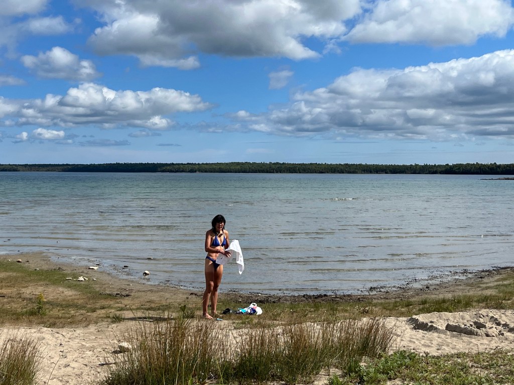She was, in fact, so good that Diana and I ended up arriving at the ferry in time to take a swim in Lake Huron before the ferry, and even with that we were first in line for the ferry. For all those doubters and haters out there – see the photographic proof – with all the cars lined up behind us!