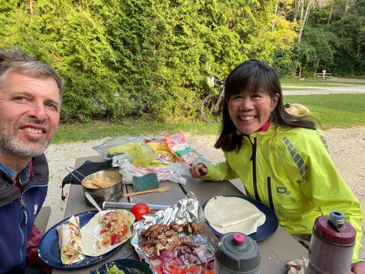 Eventually we made it to Meaford – another Georgian Bay town (Georgian Bay is officially part of Lake Huron but I guess Lake Huron-ites view Georgian Bay quite differently from the rest of the lake because it is deeper and colder. Which, from our Lake Superior perspective is funny – because it’s like bath water compared to Gitchee Gumee). We’re in a great campground on the beach, had fajitas for dinner (and they actually had a fire grate for the first time since Wisconsin – small miracles!), and then Diana made her now famous baked apples for dessert. Kind of funny – we weren’t sure we had any apples left – turns out that there were six stow-aways in various parts of our baggage. No wonder those hills were hard today . . .
