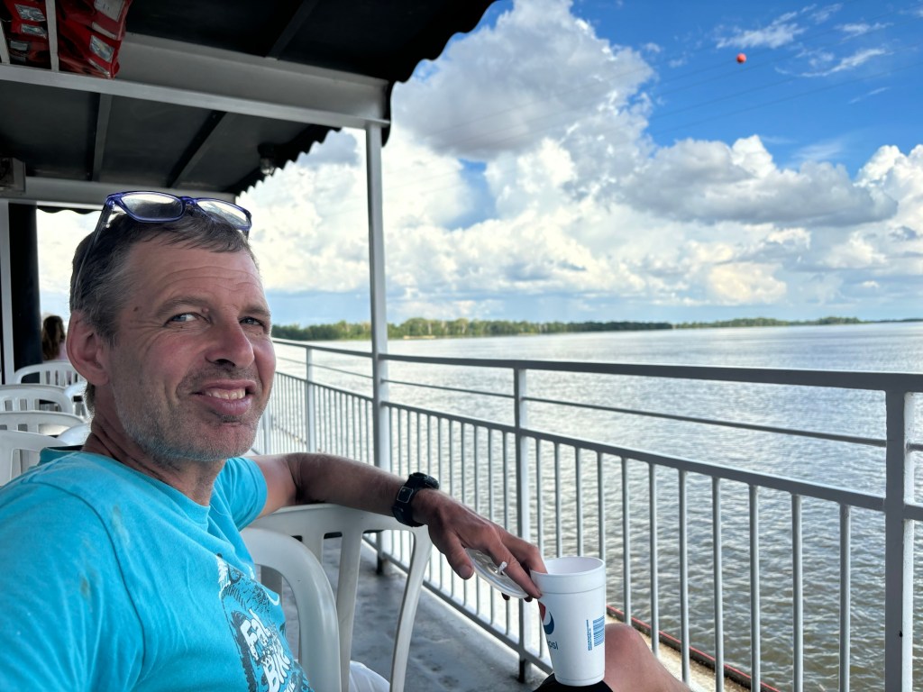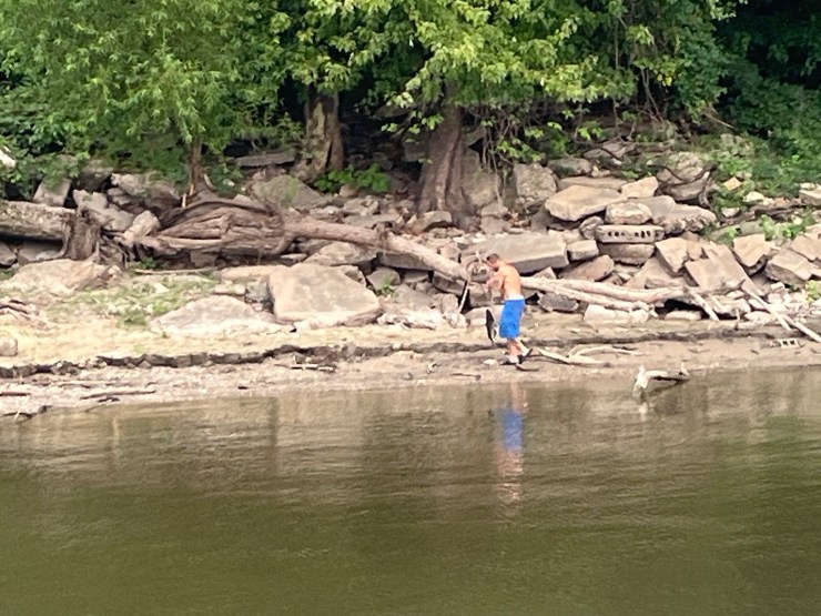 Interestingly, the captain didn’t mention anything about the family that had set up tents and stuff along the river. The kids were swimming in the river on some type of inflatable (yes – the same river that I have now forsworn ). And we could see what we presumed to be the dad walking back to the chaotic encampment with a big fish he had caught. I guess I thought it was a little ironic to pretend all of this didn’t exist when Mark Twain spent a lot of time writing about the nineteenth century version of people like this . . . And the cruise was supposed to be celebrating his accomplishments.