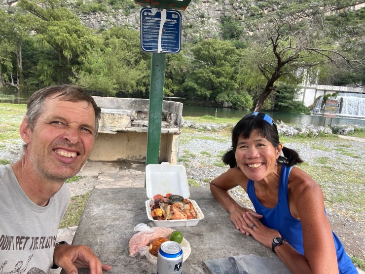 And here’s the real bonus: Without the visa mistake we would have just jetted out of Sabinas first thing in the morning. As it turns out Sabinas Hidalgo is a pretty cool little city. Shops all over the place. Vitality. Things going on. Better yet, just outside of town there is a park with an artificial waterfall, a swimming hole, and picnic tables – all surrounded by the mountain foothills that we’re coming into.