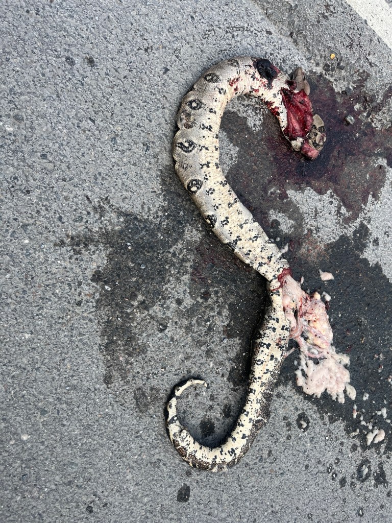 Anyway, I bike on through because I’ve hit the one-way zone at the right time. I come to the other end – about a mile or two up the road – and sit down by the side of the road to wait for Diana – happy to have a break because I have some food and I’m hungry and Diana won’t want to stop for lunch yet . . .