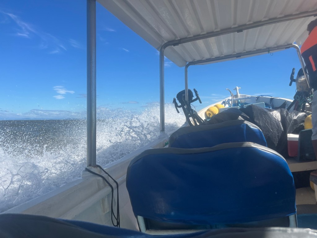 Let’s talk about the boat for a minute. Remember, we are heading out onto the ocean. But this doesn’t really look like an ocean-going boat. It’s long and skinny with rows of seating in the middle – covered by a little roof designed to provide a wee bit of protection from the sun.