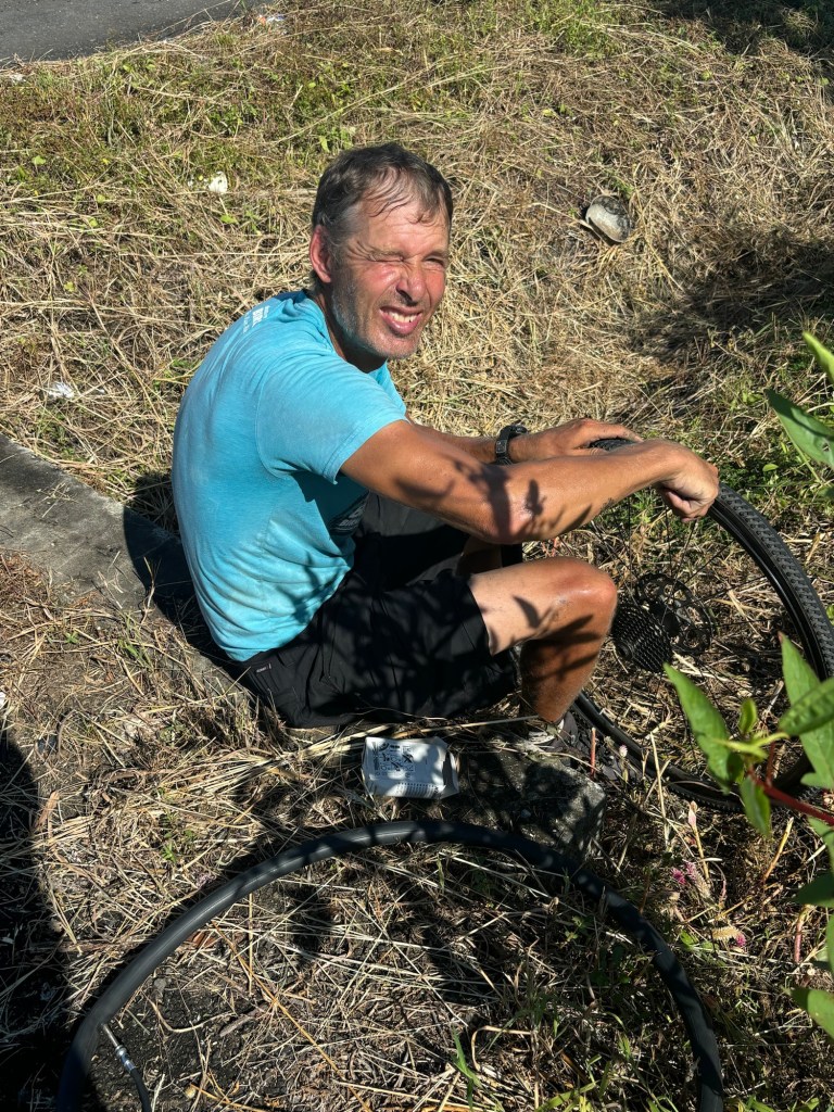 This morning, after our daily flat (aargh! – can’t wait to get our new tires in a few days here . . .), we stopped at a gas station that felt like it should have been part of a Mad Max set.