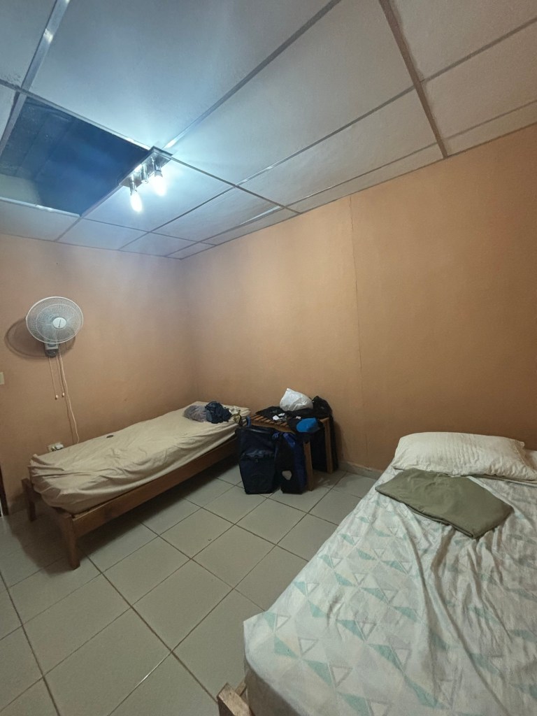 Two bare single beds sit in a plain room. Sheets but no blankets. There is a pillow on one of them. There is a big hole in the ceiling -with a bare lightbulb, but it looks like the roof is still intact. There is a fan mounted to the wall. There are no screens on the window – but there are some curtains anyway. Off the main room is a small bathroom. There’s a shower and a toilet, but no toilet paper or towels.