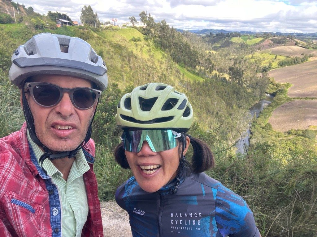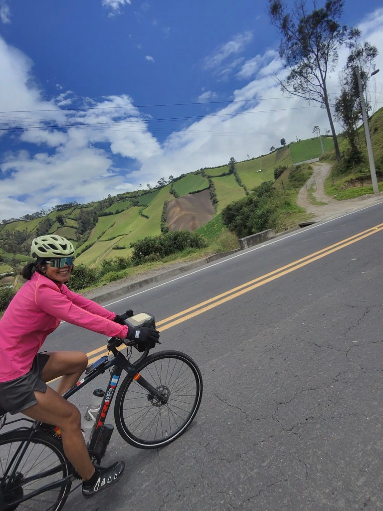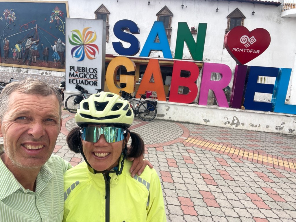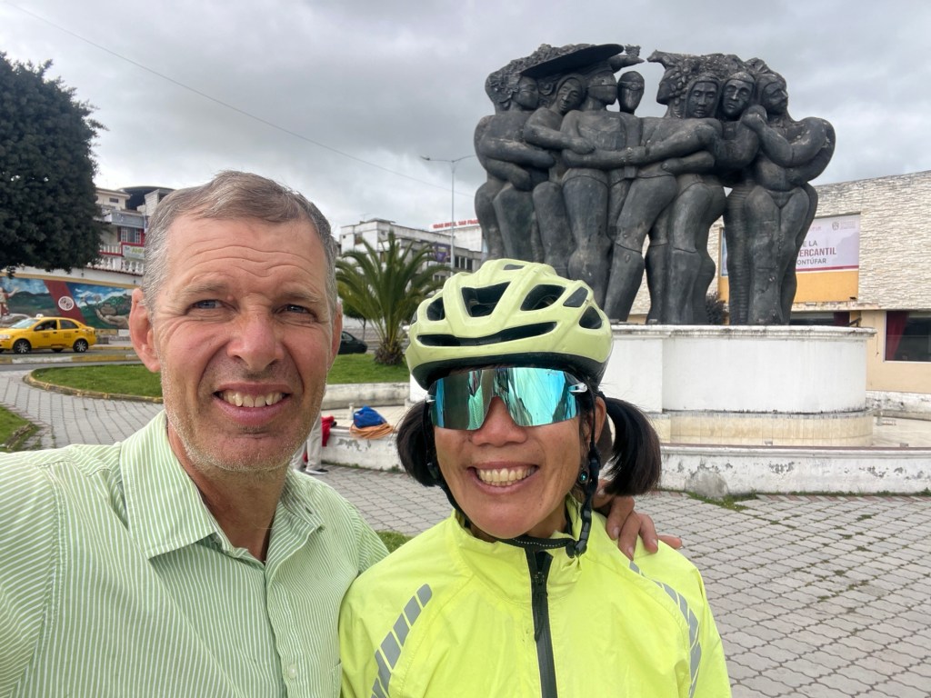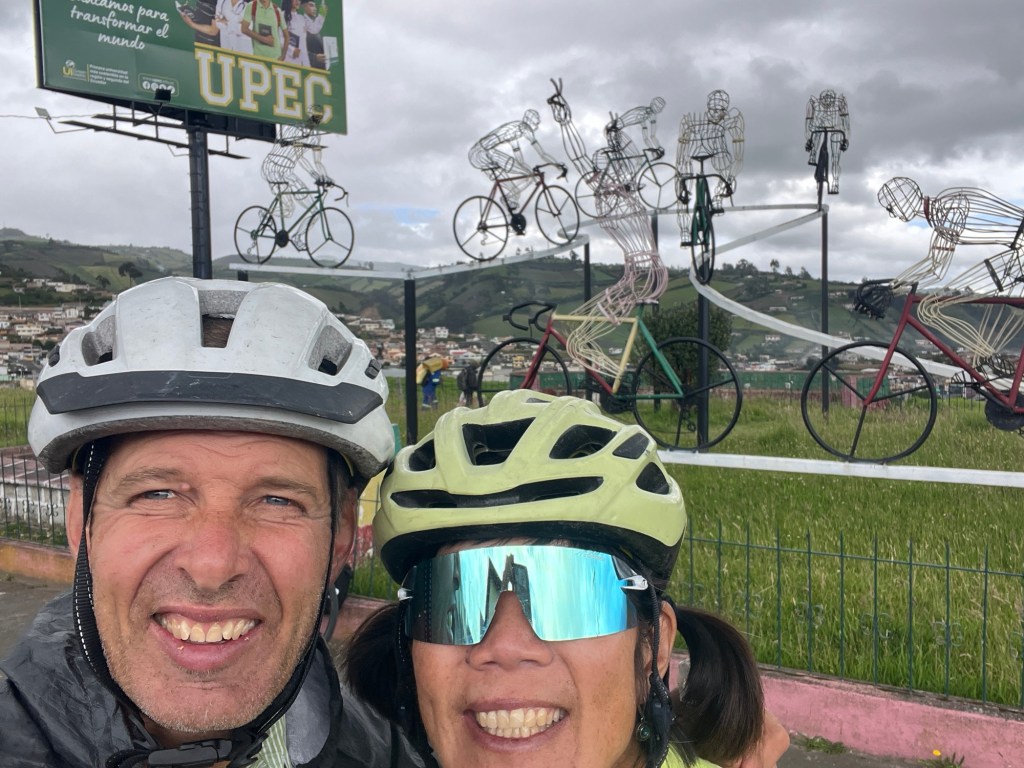 First impressions of this country on the equator . . . Beautiful, duh! Lots of bucolic scenes. Seems like there are a ton of small farms all over the hillsides. And biking! It’s what, Tuesday? And there are bikers everywhere. And they aren’t just ordinary putzs. These people look serious. Serious bikes. Serious fitness – they were flying up the mountains. I’m guessing there were some pros among the people we saw today. But it’s not just the bikers themselves. There is also bike infrastructure and bike art. Ecuador – or at least the part we were in today – seems super into biking culture.