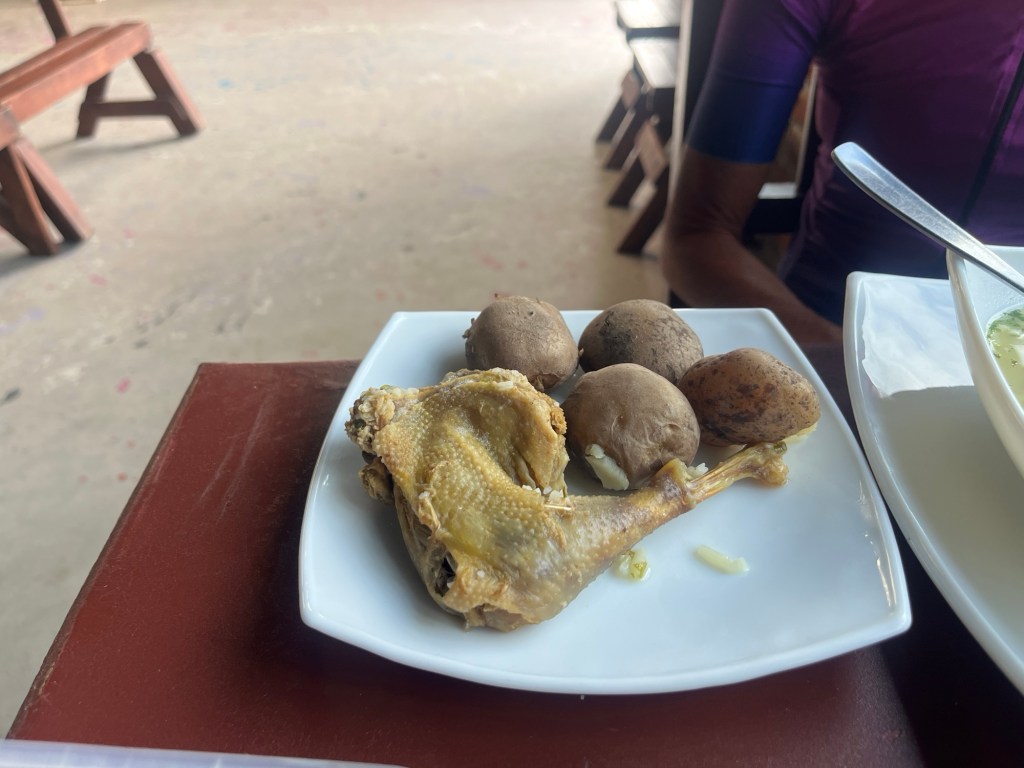 William made me a mean burger and Diana a nice bowl of gallina (old rooster) soup. The soup is good, but we can’t really figure out the attraction of the old rooster part. See exhibit 1 – the old rooster leg that Diana didn’t eat . . . (Totally justified: as you would expect, old rooster is tough as hell . . .)