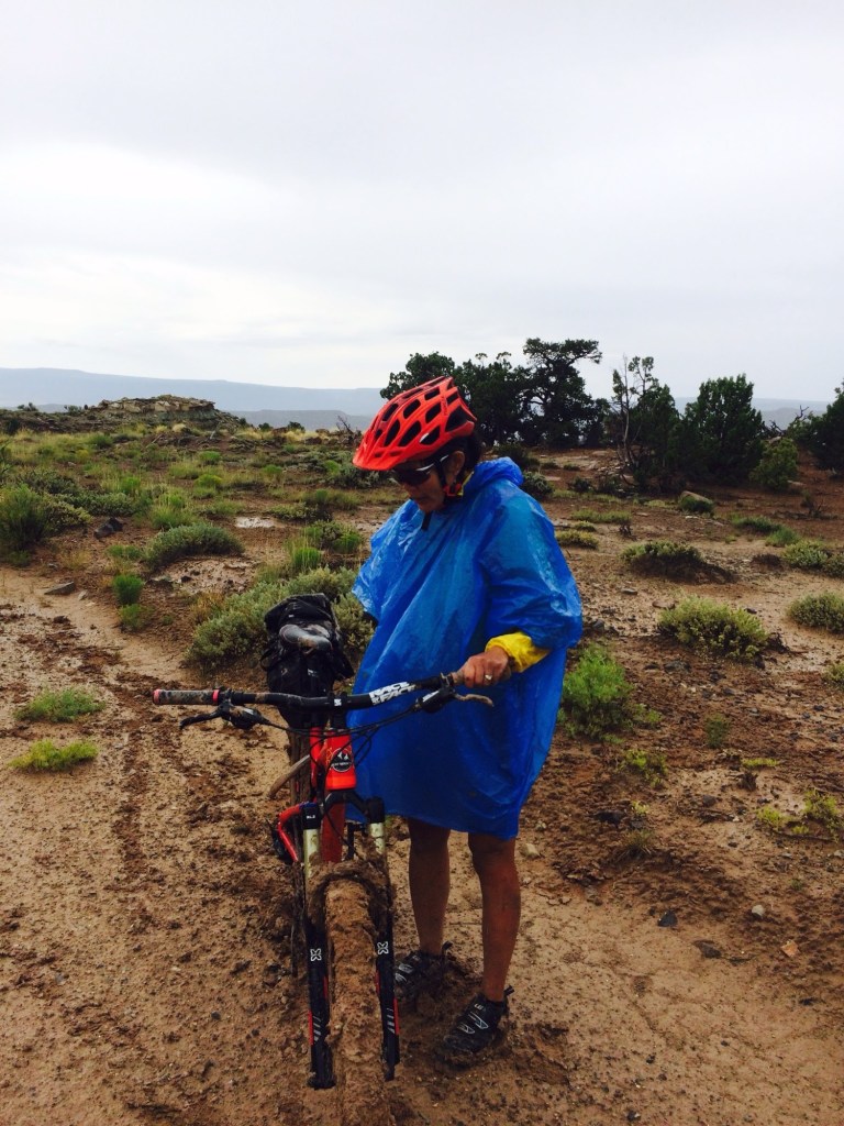Oh, my goodness. It was crazy. After about 30 seconds of rain the road turned into peanut butter alley. It turns out that when you roll a bicycle tire through peanut butter all the peanut butter sticks to the tire. Worse, it’s like a snowman – with each successive turn of the tire more peanut butter builds up. Pretty soon your bike literally weighs 100+ pounds and is completely encased in sticky icky mud.