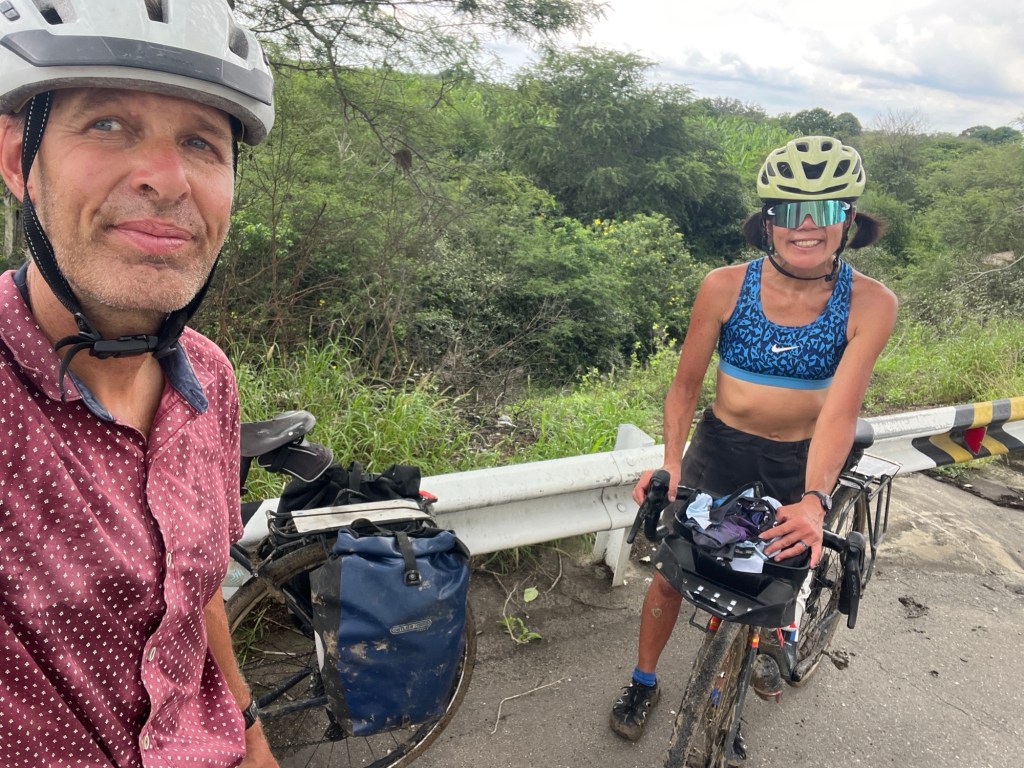 Re-pack the bikes and take the little road through some banana plantations. We eventually emerge into the chaos that seems to mark all the Latin American border towns. Vendors, people, tuk-tuks, and taxis everywhere. And everyone’s shouting as they hawk their wares: “Arepas, arepas, arepas.” It’s quite the scene.