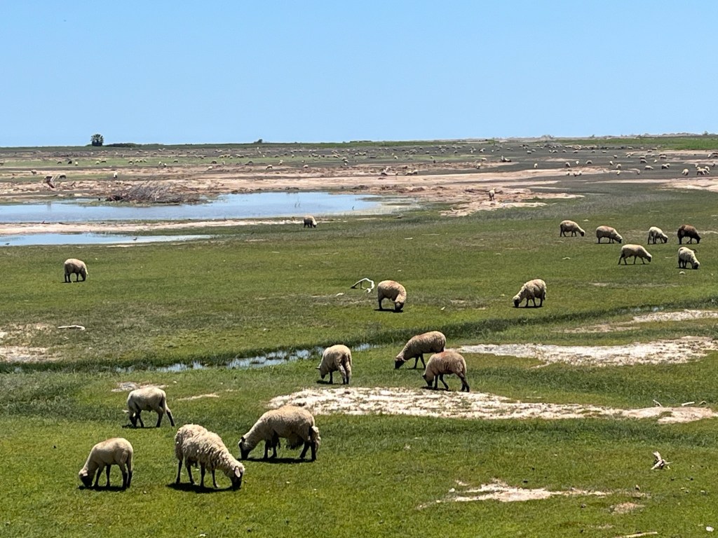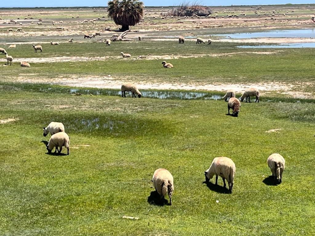 Surprisingly, almost shockingly, really, we came across an oasis of green. I guess where the Rio Losumba comes into the Pacific it forms a huge delta. So pretty to see actual grass after miles of sand. Corn fields. Sheep. Lots of sheep. Goats. Some cattle. Trees.