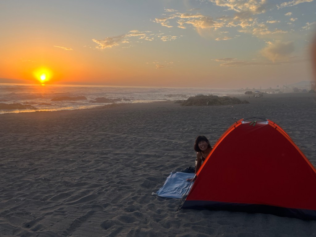 So now we’re snuggled up a few feet from the crashing waves in our new tent. The surf is already starting to lull us to sleep.