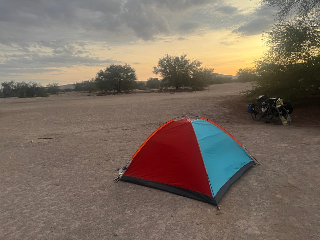 So now we’re sitting in the tent. And you know what the worst part is? I’m afraid it’s going to rain tonight. There are big storm clouds to the east – where the mountains are. This Holly Hobby tent that we have is definitely not designed for anything but the barest sprinkle. The rain fly is literally 2’ x 2’ – just big enough to fit over the small ventilation screen in the top of the tent. Oh, and we’re set up in a flood plain – did I mention that? And you remember that peanut butter mud up at the Ecuador/Peru border? This stuff looks more like concrete . . . even worse.