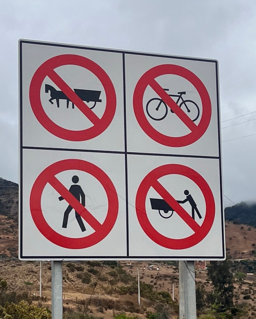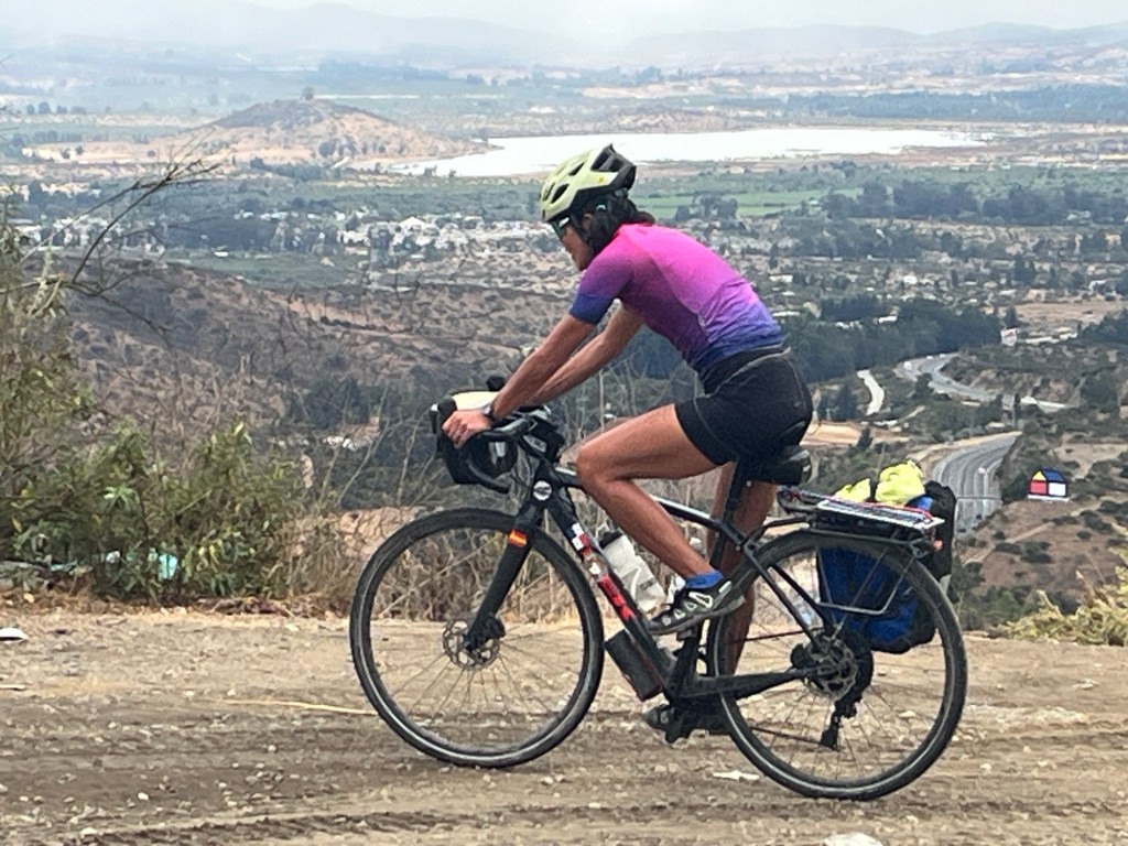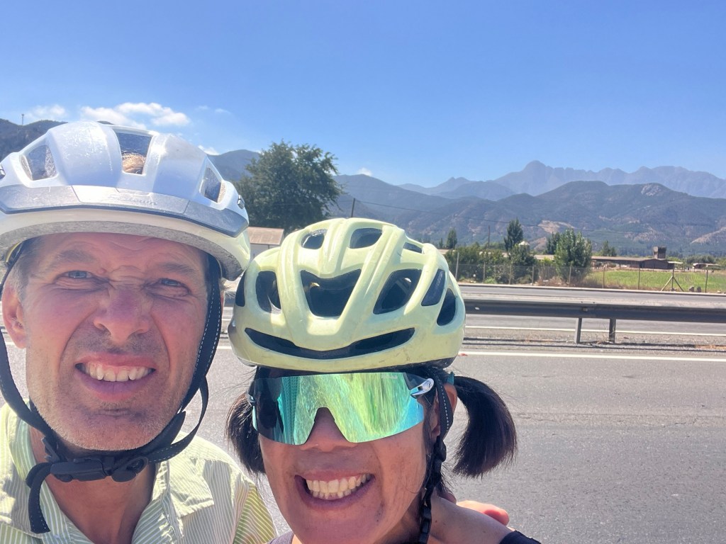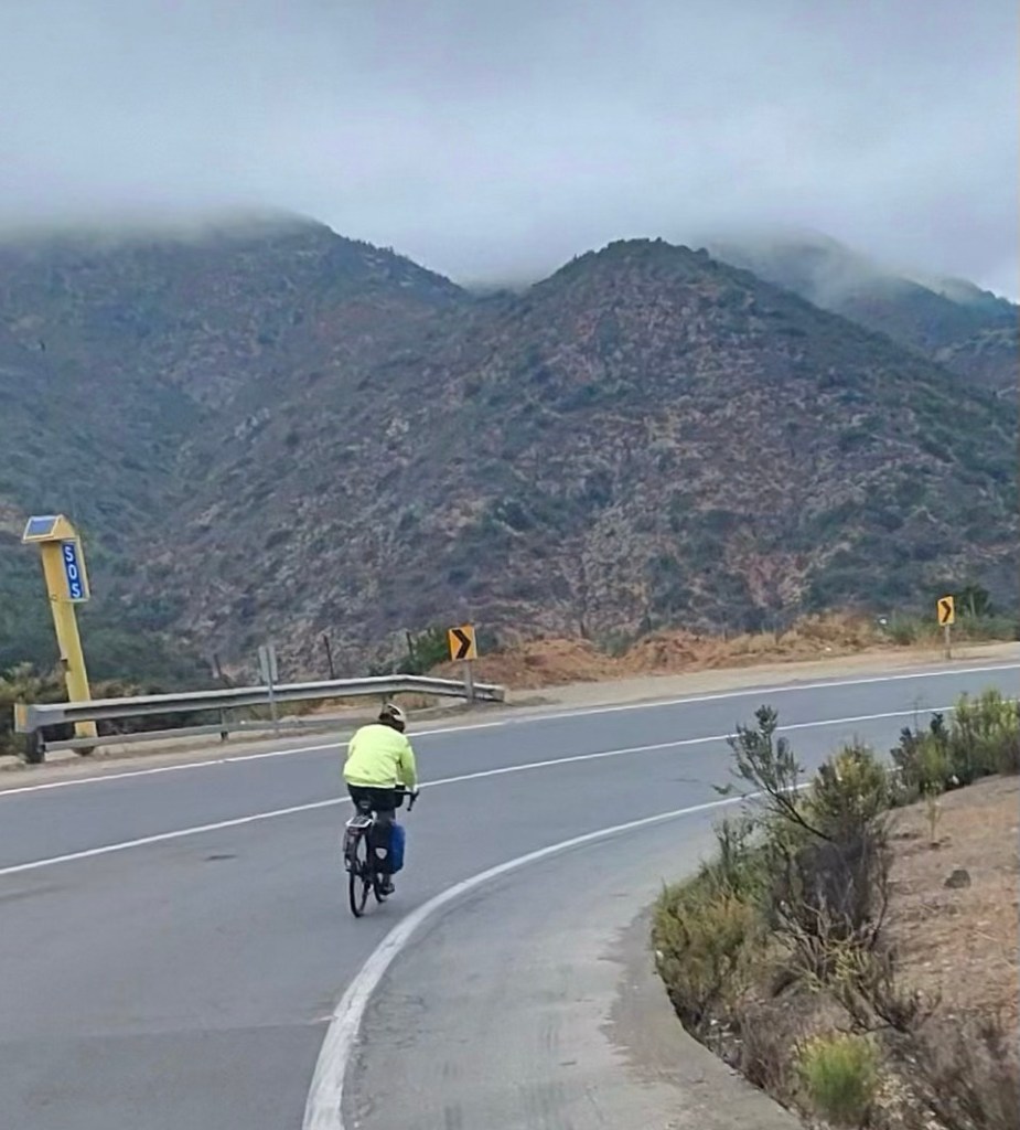 Today. Well, definitely a dismal start to the day. And we were still a little down after the campground fiasco. But the sun eventually came out, we cheered up, we found a gas station convenience store, and we went over a pass and into a fertile valley surrounded by Andes foothills. Oh, and the wind was at our back. All good.