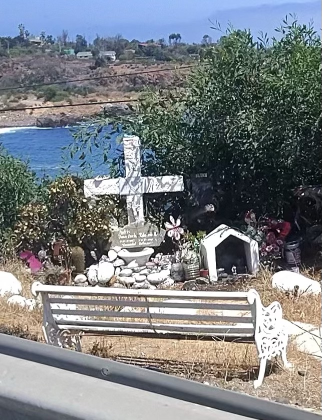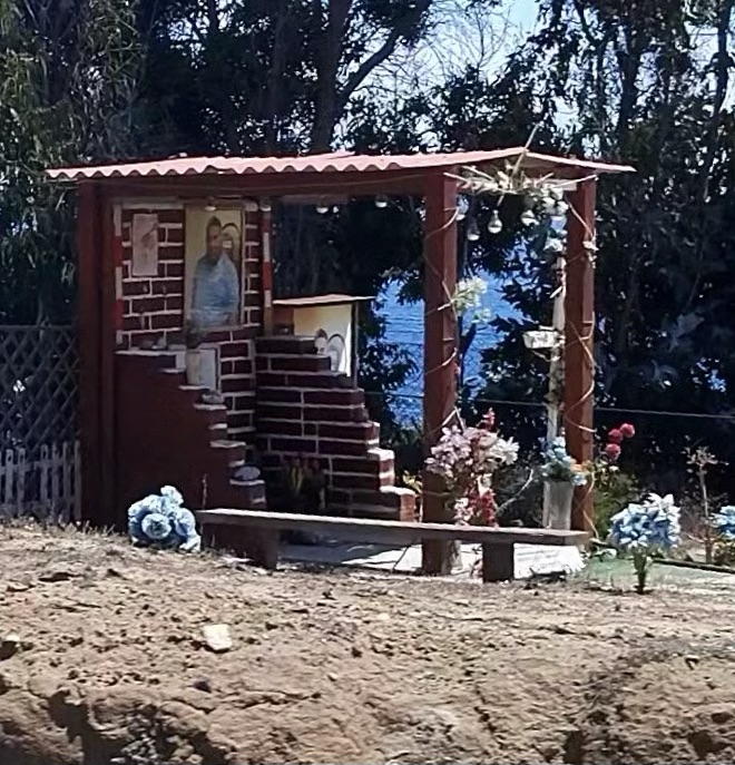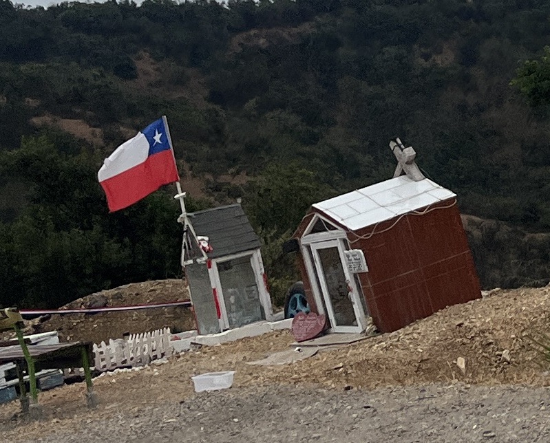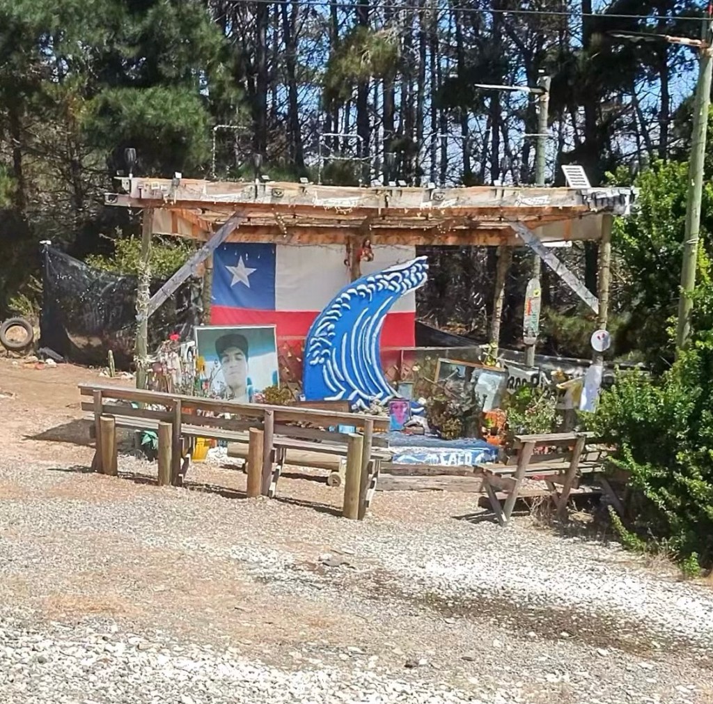 As far as we can tell, pretty much all of Latin America has these religious or quasi-religious seeming shrines along the road. I’m still not sure we completely understand them, but the shrines in Chile seem like they are on a whole different level than the shrines in, say, Mexico or Colombia. They’re bigger. They often include big pictures or even life size photos. Some of them are shaped like semis. And it seems like they are more well tended.