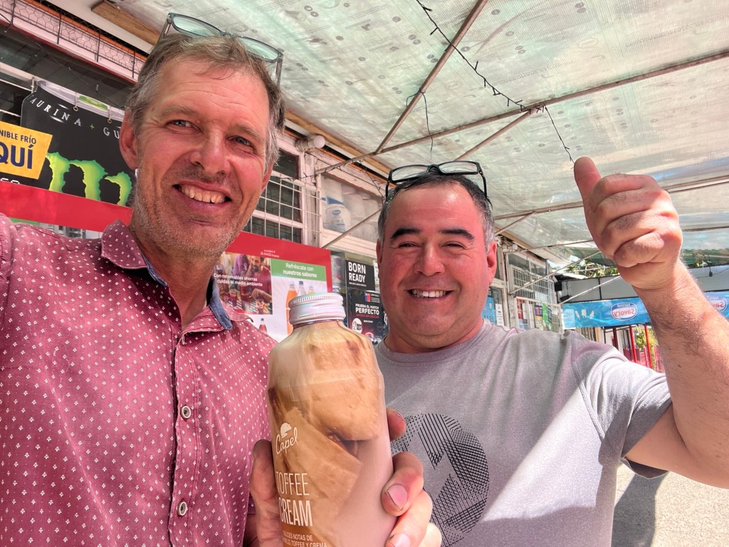 No matter. We’ve come to like these places. You walk in and it’s clear that the place is like Cheers – where everyone knows your name. The cashiers and the other customers were super helpful, and, another guy, Luis, who turned out to be the owner, was very interested in our trip. We asked about wine and Luis was soon pushing vino at us – in big bottles that we could never drink in a million years. In the end, we asked about Pisco Sour – but that bottle was too big as well, and we bought a smaller bottle of pina colada instead. As we were about to leave Luis came out with yet another bottle – toffee liquor – a regalo (gift).