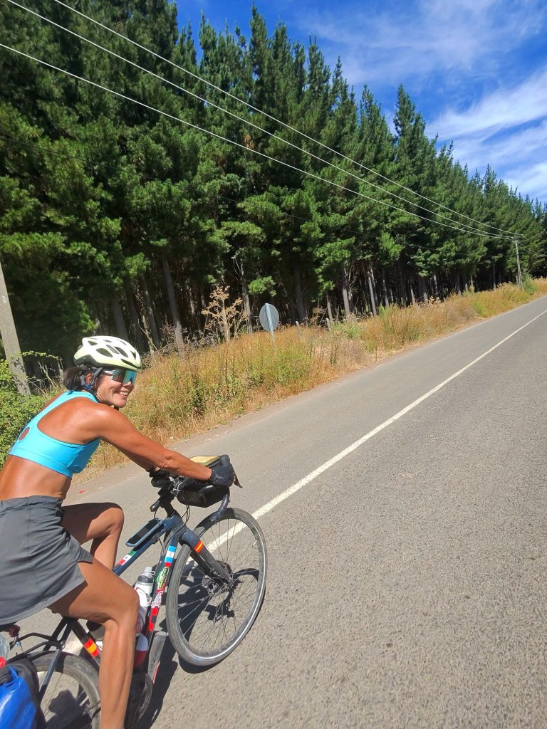As we rode along today the scenery changed right before our eyes. More snow-capped volcanoes way off to our left (east – toward Argentina). More happy cattle grazing on lush grasses. More pine trees. Lots of water. And fewer vineyards – though there are still plenty of wild grapes . . .
