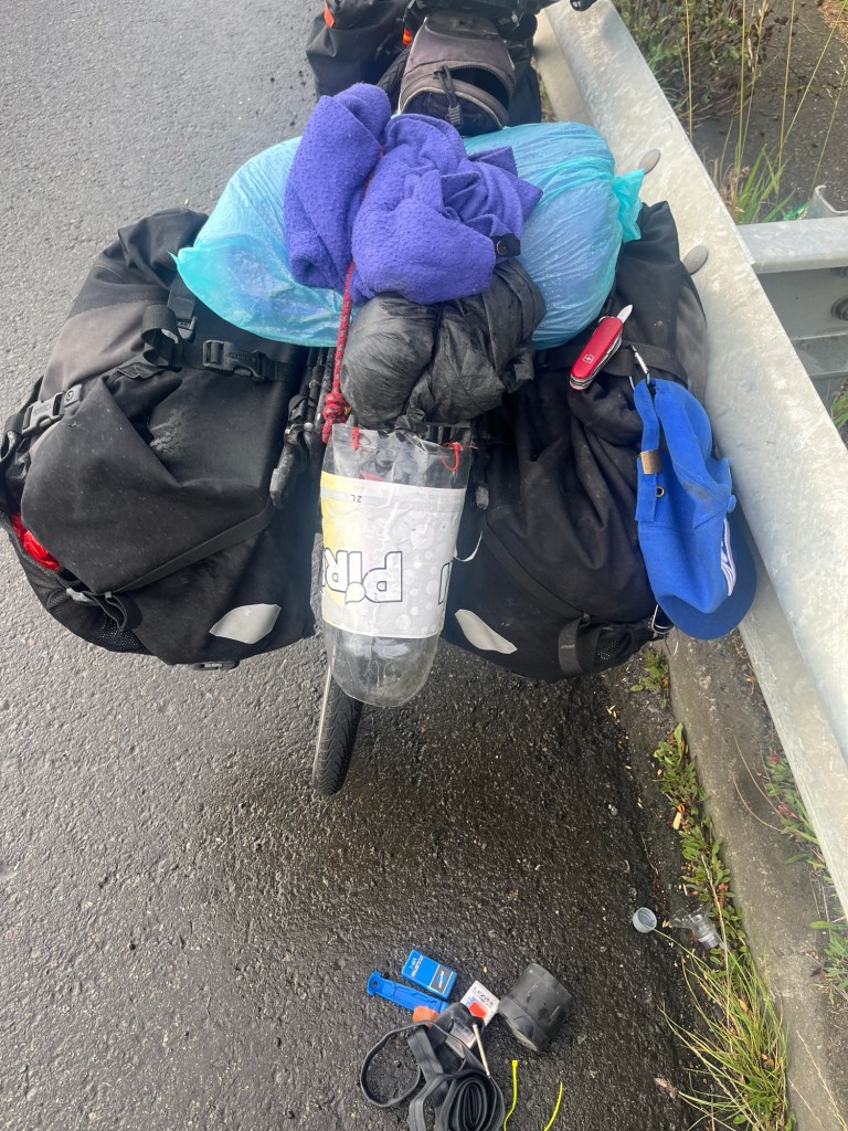 Fenders? Hmm. Didn’t have that figured out yet. But, as some readers suggested today, there is another solution. Sadly, what is pretty much always available in Latin America? Big plastic pop bottles.