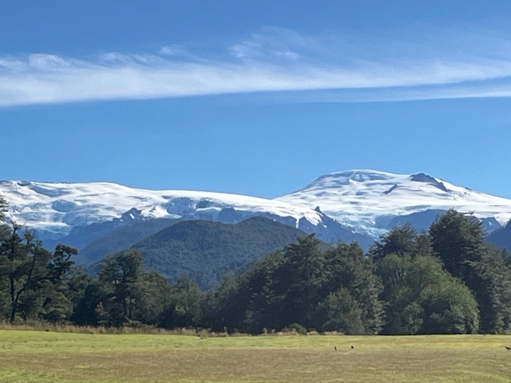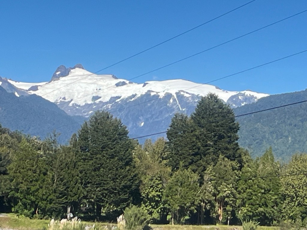 I think we saw snow-capped peaks the entire day. More and more of them the farther south we go. And the snow seems lower and lower. I would guess we’re seeing snow at 2,500’ now. This being the Patagonia mid- to late-September now, this is probably the time of year with the least amount of snow around – so it is pretty telling of the climate here that there is snow so low on the mountains . . .