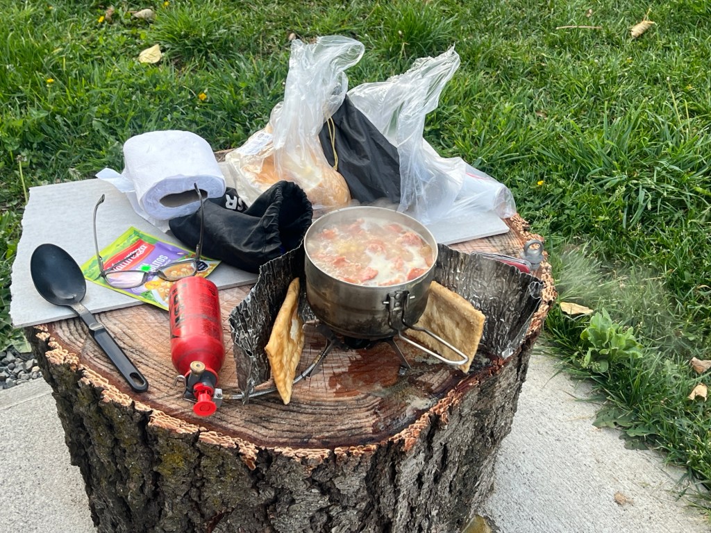 So we’re planning a VERY basic camp stove dinner. I bring the stove outside of the motel type facility and start setting up. But Mary is out in the yard as well – cooking something on her stove, which is inexplicably (at least in US logic) sitting in the middle of the back yard.