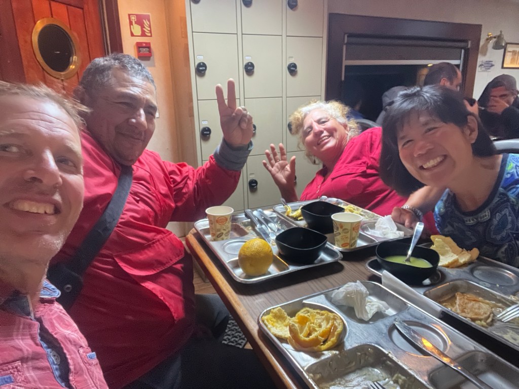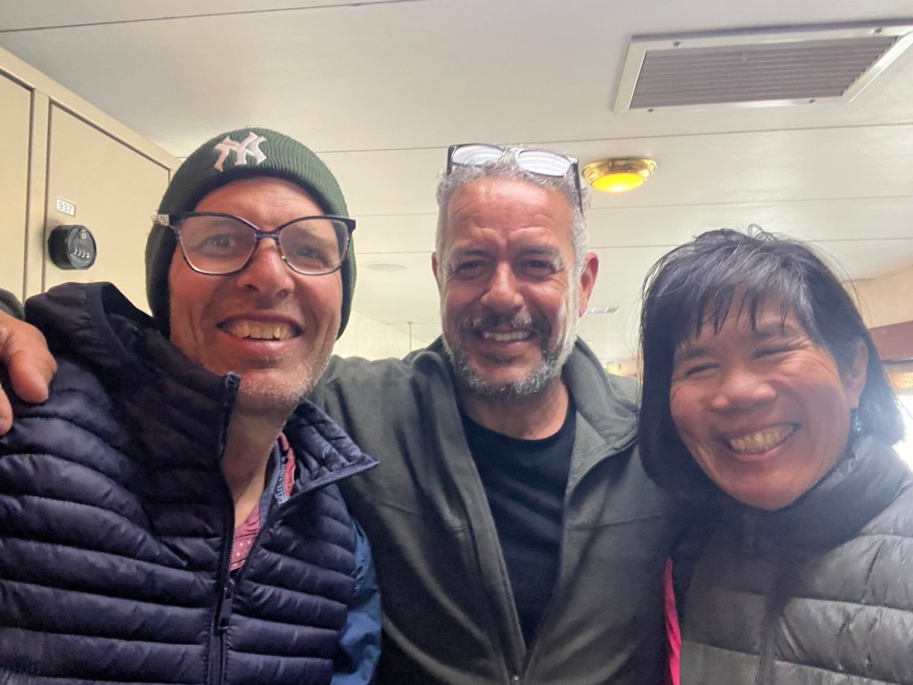 The ferry is not exactly a cruise ship. Probably a tenth the size. No ping pong, no tennis, no swimming pools, no exercise areas, no roving bands . . . Still, these last few days may be about as close as we come to a Love Boat type experience. Not so bad, really. Especially when there is no wifi. It’s like when we were in high school and everyone chatted everyday at lunch. Because, remember, when we were in high school there were no cell phones. The options were chat or . . . I don’t know . . . look at the wall . . .