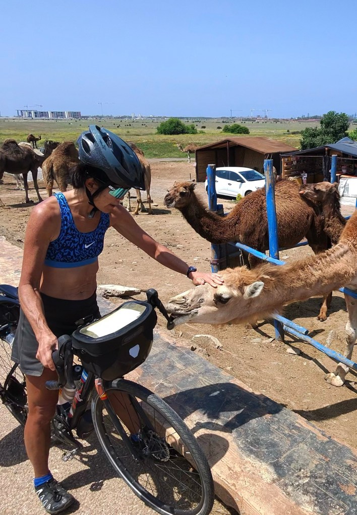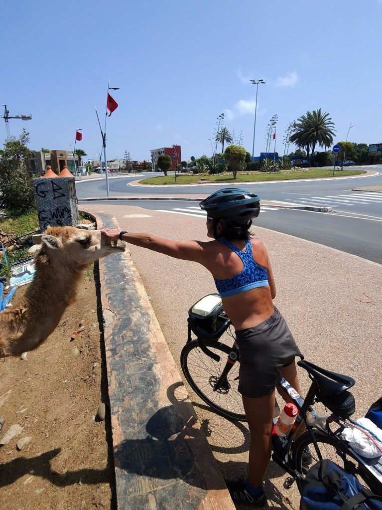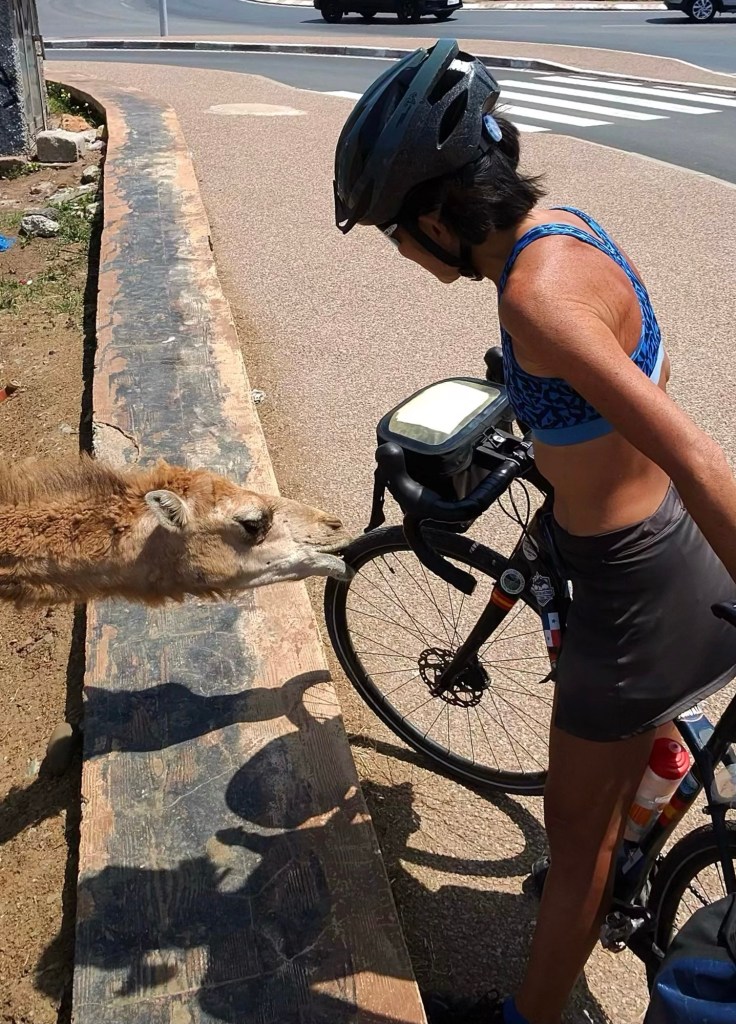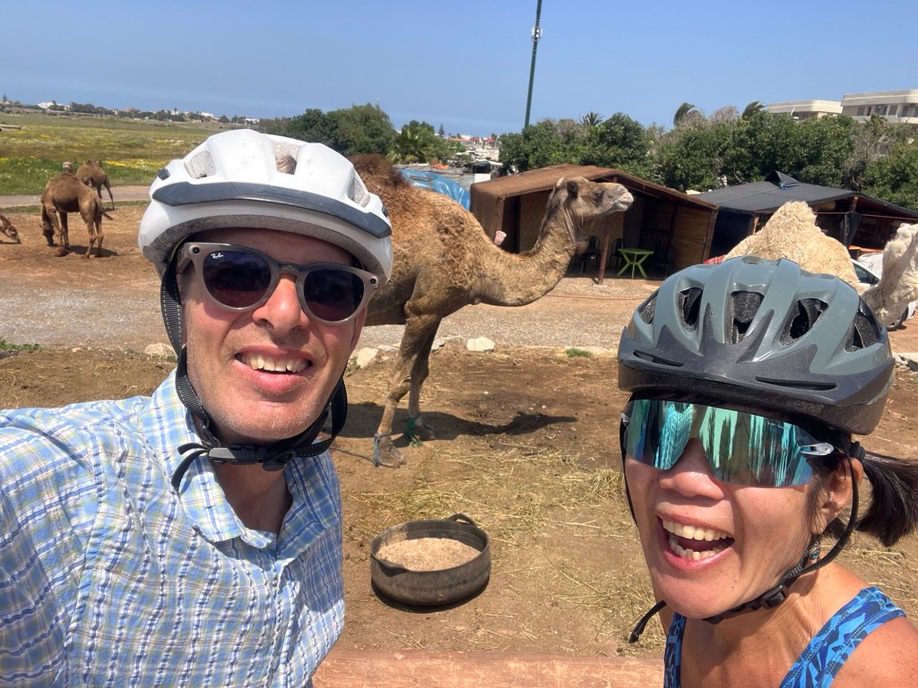 We happened upon a random caravan of camels. And since we’re in Morocco – which is more like Latin America than the U.S. when it comes to rules – we were able to walk up, pet them, and feed them carrots (we still had one left from our encounter with the nice Casablanca family the other day). One of the camels even tried to eat Diana’s bike . . .