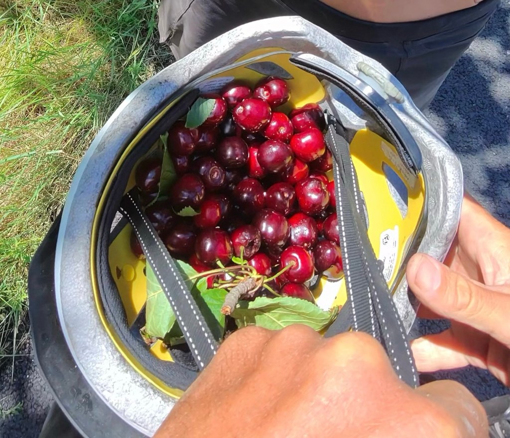 Now, you might need to climb up into the trees to get the good ones. And you might even need to employ your helmet as a basket to put them in. But all in the pursuit of that one moment of transcendence – when you are eating mouthfuls of perfect cherries and the juice is dripping down your chin and, in that one moment, you lose all sense of where you are or what you’re doing – you just know that these cherries are like a great drug and you want more . . .
