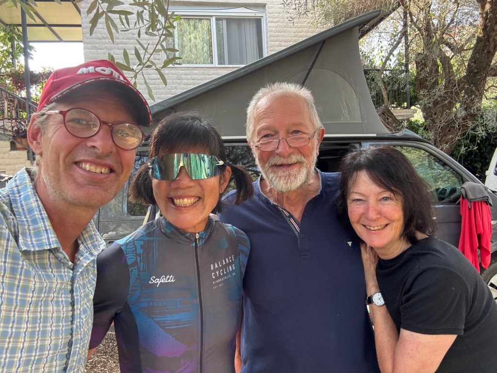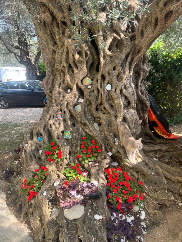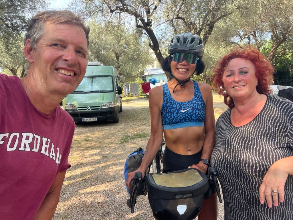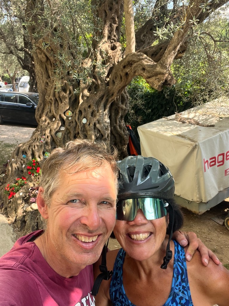- Like Kathy – our camp host tonight. She laughs and smiles and helps us figure out our laundry, and she tells us the best way to bike in the morning. They have an olive tree on the property that is over 600 years old. So cool!