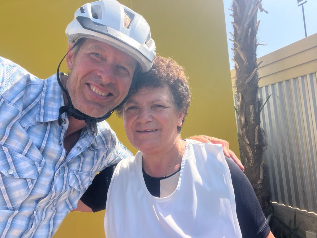 Nonetheless I pressed the change into her hand and then asked if we could take a picture together. She was happy to oblige, and then started blowing us kisses as we biked off.
