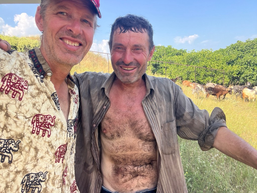 Peter has about 50 goats and 20 or so sheep – some with big, cool horns – evocative of the Rocky Mountains . . . He also has, I think, five big dogs. Apparently the enforcers in the crew, though they look pretty mellow . . .