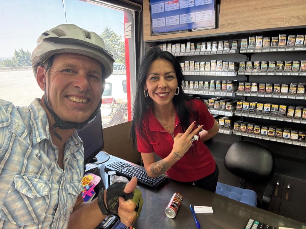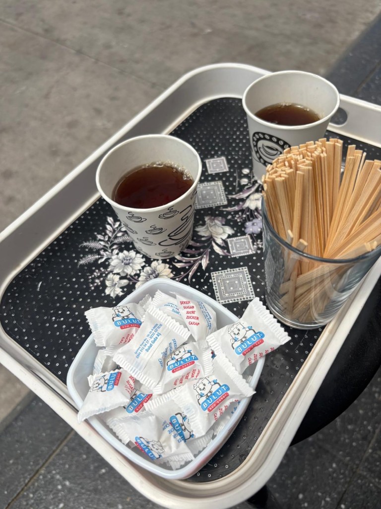 Anyway, after the compliment, she asked if we wanted tea. I love tea, and we’ve kind of gathered that tea is a thing here – kind of like it is in Morroco. A minute later we’re sitting outside the gas station and the cashier has given us a tray with a full tea service – as if we’re the King and Queen of England or something.