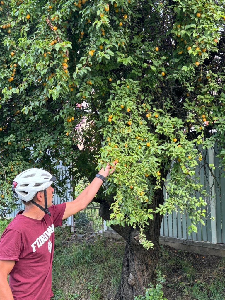 We had another “rules” encounter this morning. We’re biking along when Diana sees a tree full of fruit in the right of way along the road. Turns out to be little yellow plums – perfectly ripe. We stop to pick a few. We put the bikes down, cross the street and …