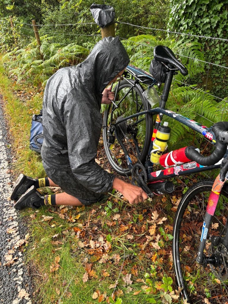 She knows instantly. She has snapped another derailleur cable. So now we’re fixing Diana’s bike – in the pouring rain. Which kind of goes on the not-so-good side of the dialectic register.