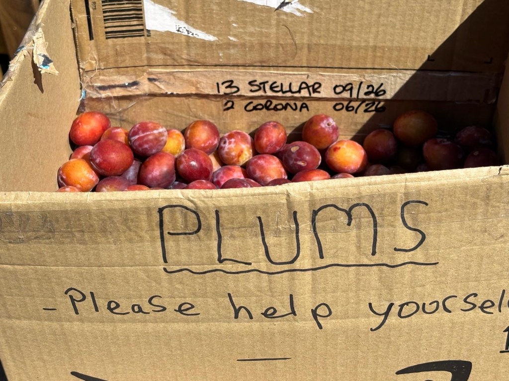 Plums. Okay, the plums are no better than they were in Serbia, but they’re still pretty good. And, unlike in some countries, who will remain nameless, but who may have at one point been in an Eastern Bloc country that included present-day Slovakia, no one yells at you for picking a few. In fact, quite the opposite. We found a whole box full of sun-warmed fruit – with a sign reading something like: “Please take what you want.”