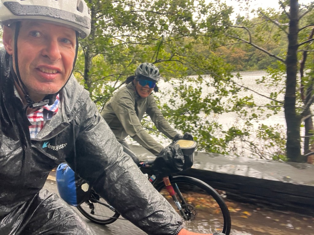 We’re instantly wet – through and through. We’re getting pelted with big cold pellets from above. And from below – the spray from our wheels is making sure that we’re fully drenched – from head to toe.