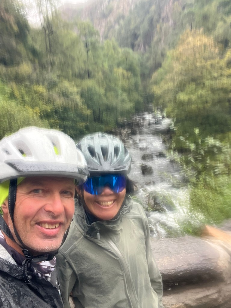 So now we’re on our bikes and it’s raining and we’re heading up our last big climb of the day. It’s still beautiful – but Diana let’s out an exclamation . . .