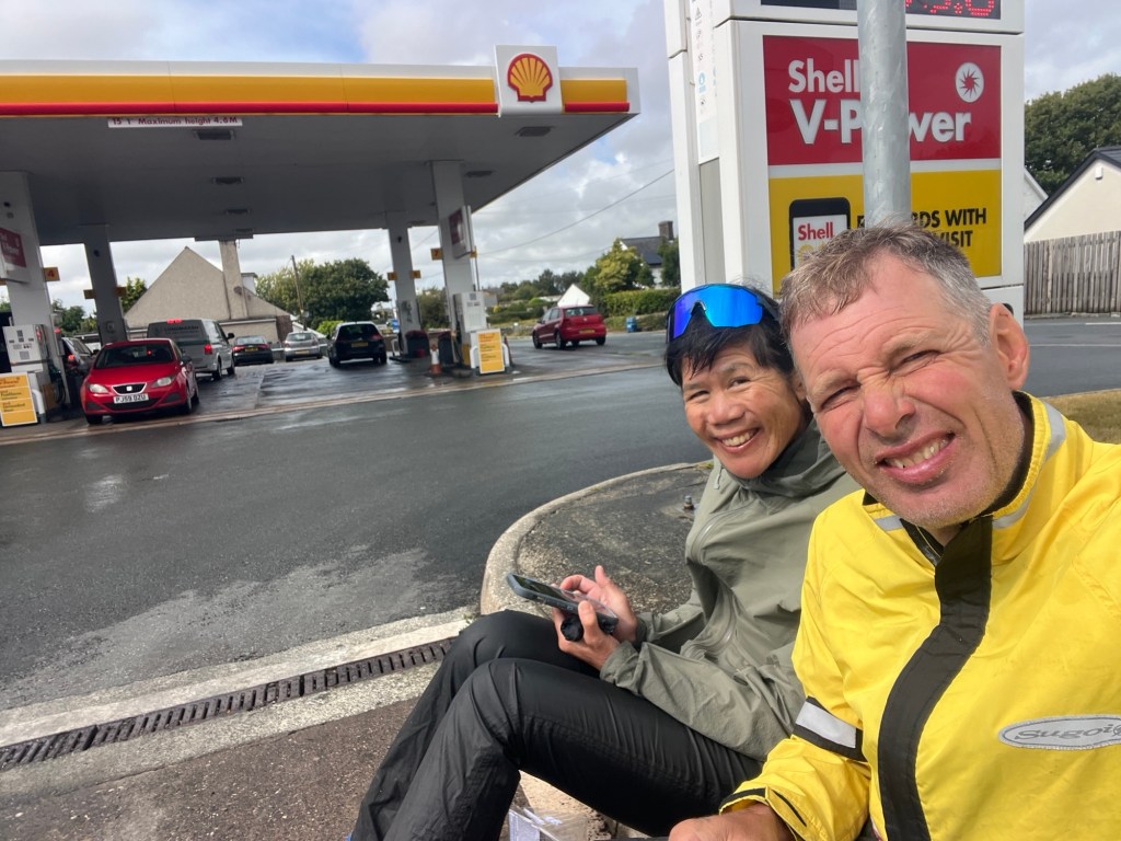 But out of this misery a good thing springs. Because before long Hew Johns and Sam Quelen (sp?) come biking down the road. They pull over to make sure we’re okay. Turns out they are aspiring professional riders. They explain that they don’t mind the rain because there aren’t as many tourists around and the roads aren’t as busy.