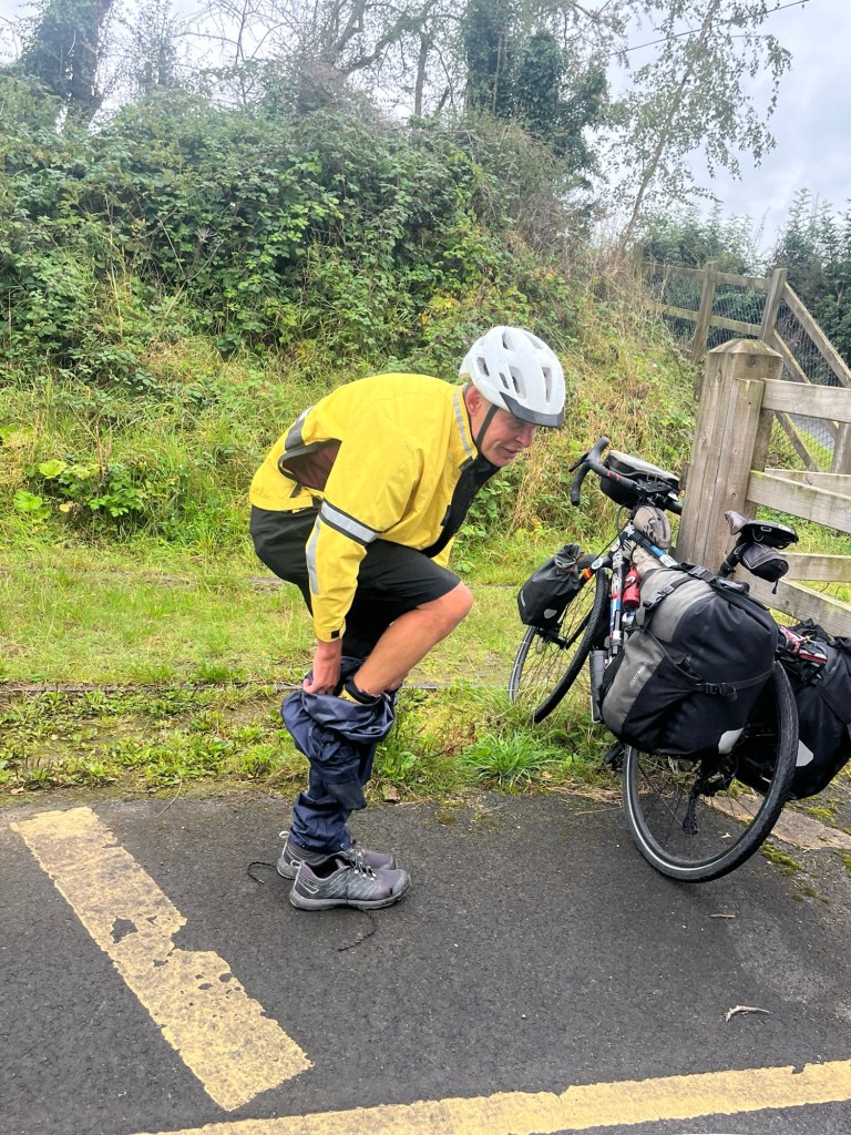 - Of course, now the rain let’s up and the sun peaks out. But you are encased in impermeable rubber – so you are wetter now than you would have been had you just left the rain gear off from the beginning – only it’s worse because it’s not rain – you are drenched in your own sweat. So now you stop again. Remove the rain jacket – which is easy; but also remove the rain pants – which requires taking the shoes off once again. And if you are a fussy person – which, thankfully, neither Diana nor I are – you probably need to go through your clothing pannier to fish out a new pair of socks. Sadly, they’re at the bottom of the pannier – so you have to empty all your clothes out onto the pavement.