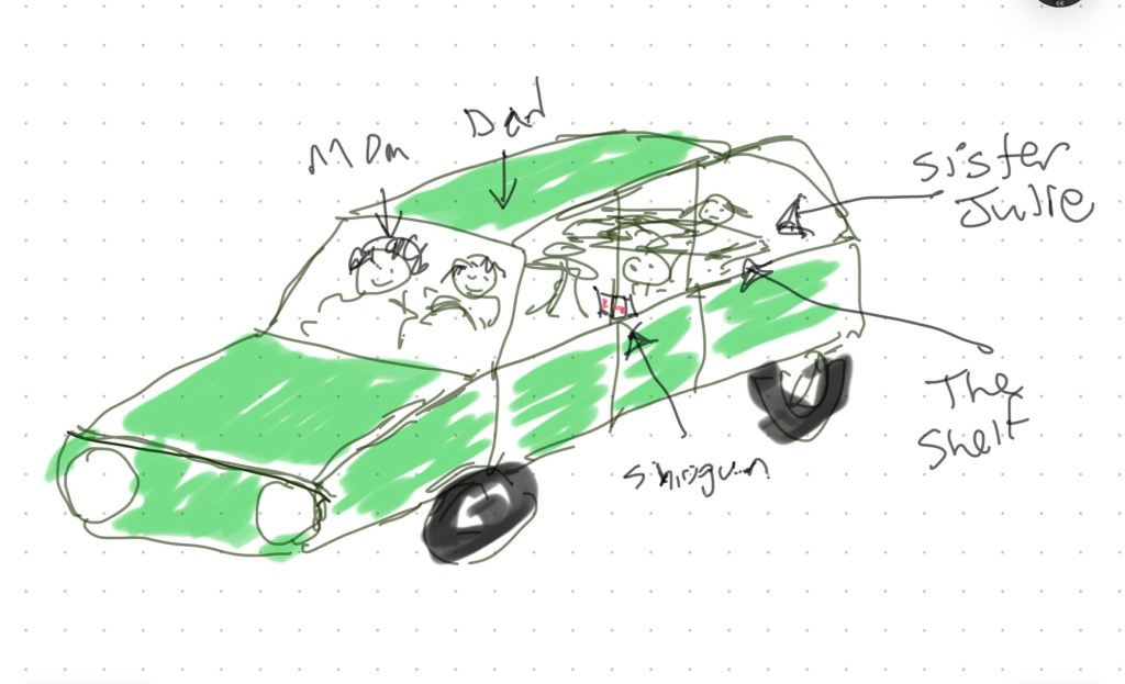 The other incident that colored the trip? Well, there were three of us kids, and my Dad figured that if we were all in the back seat we’d kill each other – so he built a little shelf for my sister to lie on. (Not exactly up to modern safety standards – no car seat, no safety straps – no nothing – just my sister lying on a piece of wood . . .) The shelf went between the side-windows in the back of the station wagon. “Built” is probably the wrong word. I think he just took a piece of a 2×12 and placed it between the windows.