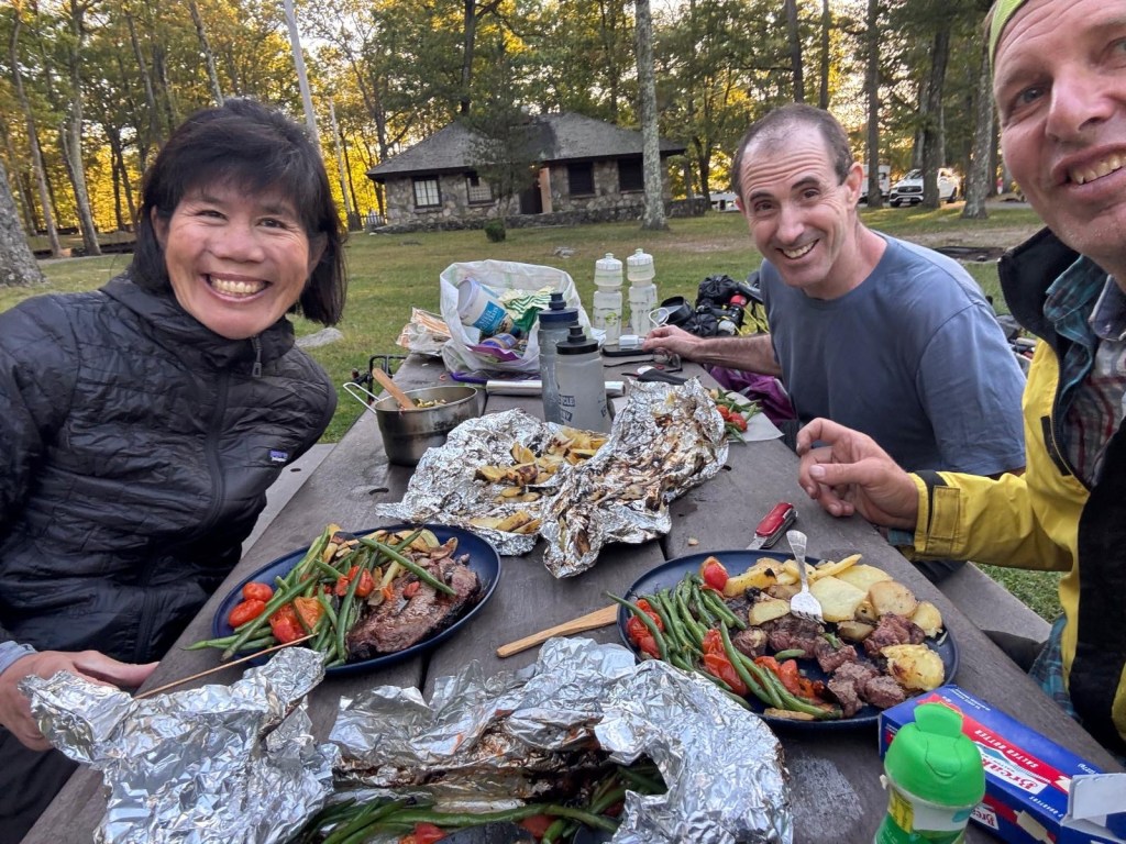 Pretty great fire grate dinner – featuring potatoes, green beans, salad and steak.