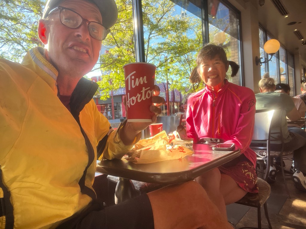 The other highlight of the day was, of course, Tim Horton’s! We first realized what a global treasure this institution was when we biked to Toronto two years ago. The coffee. The French crullers. The bagel sandwiches. Even the tea is exemplary.